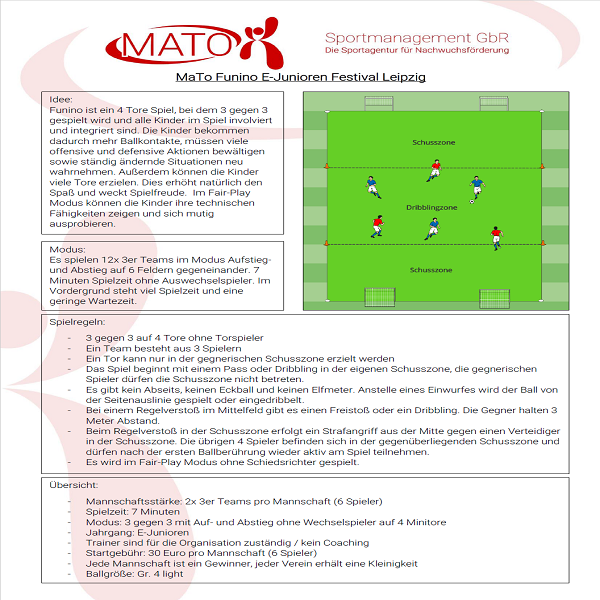 wir möchten euch sehr gerne zum MaTo E-Junioren Funino Festival am 27.04.2019 einladen. Funino ist ein 4 Tore-Spiel im 3 gegen 3. In 7 Minuten haben die Kinder viele Aktionen mit dem Ball und es werden immer wieder neue Situationen geschaffen. Im Modus Auf- und Abstieg spielen die Kinder 7 Spiele. Insgesamt haben alle Kinder in einem kurzen Zeitrahmen sehr viel Spielzeit, sodass Funino ein absolut kindgerechtes Turnier darstellt. Jede Mannschaft stellt 2x 3er Teams, sodass pro Mannschaft 6 Spieler zugelassen sind. Das MaTo E-Junioren Funino Festival besteht insgesamt aus 4 Turnieren. Pro Turnier können 6 Mannschaften mit jeweils 2x 3er Teams teilnehmen. Gespielt wird auf 6 Spielfeldern. Gerne könnt ihr auch mehrere Mannschaften anmelden bzw. an mehreren Turnieren teilnehmen.