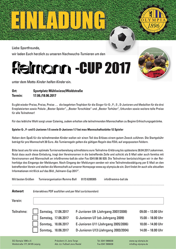 Bitte lasst uns für eine optimale Turniervorbereitung schnellstens eure Teilnahme-Erklärung bis spätestens 30.04.2017 zukommen. Nutzt dazu auch diese Einladung, tragt den Vereinsnamen in die betreffende Zeile und schickt als E-Mail oder auch formlos mit Vereinsnamen und Mannschaft an info@remmo-ball.de oder Fax 0341/86 86 820. Die Teilnehmer berücksichtigen wir in der Reihenfolge des Eingangs der Meldungen. Nach Eingang der Meldungen senden wir eine Teilnahmebestätigung per E-Mail an den betreffenden Verein und stellen die Mannschaft auf unserer Homepage http://www.sg-olympia.de ein. Dort findet ihr auch alle aktuellen Informationen mit Klick auf das Bild „Fielmann-Cup 2017“.