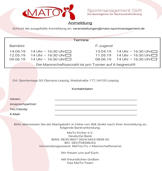 Wir würden uns freuen, euch beim MaToLiTo Festival begrüßen zu dürfen. Sollten die Trainer keine Zeit haben, so können auch gerne Elternteile einspringen.