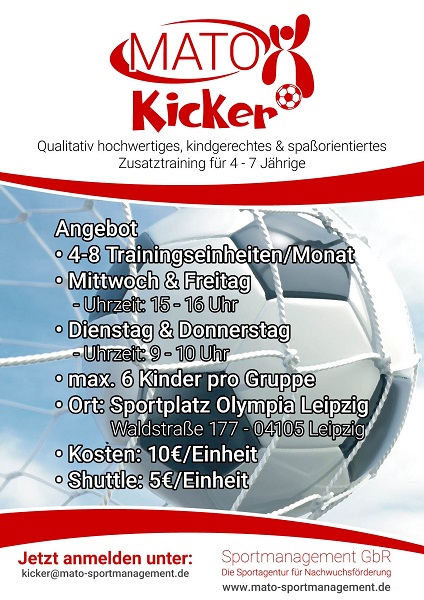 heute möchte ich euch gerne die MaTo Kicker vorstellen. Bei den MaTo Kickern trainieren 3-7 Jährige Kinder in kleinen Gruppen. Die Gruppen bestehen aus maximal 6 Kinder. Ziel dabei ist es, den Spaß am Fußball zu vermitteln und den Kindern die nötige Zeit zu geben, sich an den Vereinssport sowie auch an den regelmäßigen Sport zu gewöhnen. Die Einheiten führen qualifizierte und erfahrene Nachwuchstrainer durch und werden einen Individualtrainingscharakter mit spaßorientierten und individuellen Übungen haben. Inhalte bestehen vor allem aus einer Ansammlung altersgerechter und innovativer Übungen zur Schulung der Koordination, Ballgewöhnung, technischen Fähigkeiten und der individuellen fußballerischen Förderung. Um diese sportliche Ausbildung abzurunden, werden regelmäßig sportartübergreifende Einheiten oder Elemente in den Einheiten untergebracht. Das Training findet Dienstag und Donnerstag von 9 Uhr - 10 Uhr und Mittwoch und Freitag von 15 Uhr - 16 Uhr auf dem Gelände von Olympia Leipzig (Waldstraße 177, Leipzig) statt.