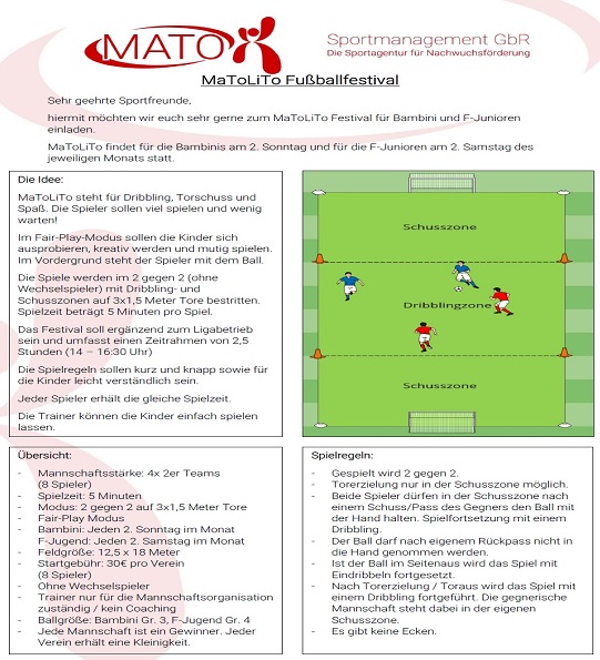 sehr gerne möchten wir euch zum MaToLiTo Festival für Bambini und F-Junioren einladen. MaToLiTo soll einmal im Monat und ergänzend zum Ligabetrieb am Nachmittag stattfinden. Die Spiele werden im 2 gegen 2 ohne Wechselspieler ausgetragen, jeder Spieler bekommt die gleiche Spielzeit. Insgesamt erstreckt sich das Turnier über 2,5 Stunden, in der aber jedes Kind eine Netto-Spielzeit von 50 Minuten hat. Die Idee hinter diesem Turnier ist, dass die Kinder frei spielen und ihre Fähigkeiten mit dem Ball ausprobieren sollen, ohne Angst Fehler zu machen. Dribbeln, schießen und Spaß haben - dafür steht MaToLiTo. Pro Mannschaft können 4 x 2er Teams gemeldet werden (8 Spieler).