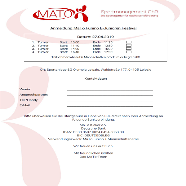 wir möchten euch sehr gerne zum MaTo E-Junioren Funino Festival am 27.04.2019 einladen. Funino ist ein 4 Tore-Spiel im 3 gegen 3. In 7 Minuten haben die Kinder viele Aktionen mit dem Ball und es werden immer wieder neue Situationen geschaffen. Im Modus Auf- und Abstieg spielen die Kinder 7 Spiele. Insgesamt haben alle Kinder in einem kurzen Zeitrahmen sehr viel Spielzeit, sodass Funino ein absolut kindgerechtes Turnier darstellt. Jede Mannschaft stellt 2x 3er Teams, sodass pro Mannschaft 6 Spieler zugelassen sind. Das MaTo E-Junioren Funino Festival besteht insgesamt aus 4 Turnieren. Pro Turnier können 6 Mannschaften mit jeweils 2x 3er Teams teilnehmen. Gespielt wird auf 6 Spielfeldern. Gerne könnt ihr auch mehrere Mannschaften anmelden bzw. an mehreren Turnieren teilnehmen.